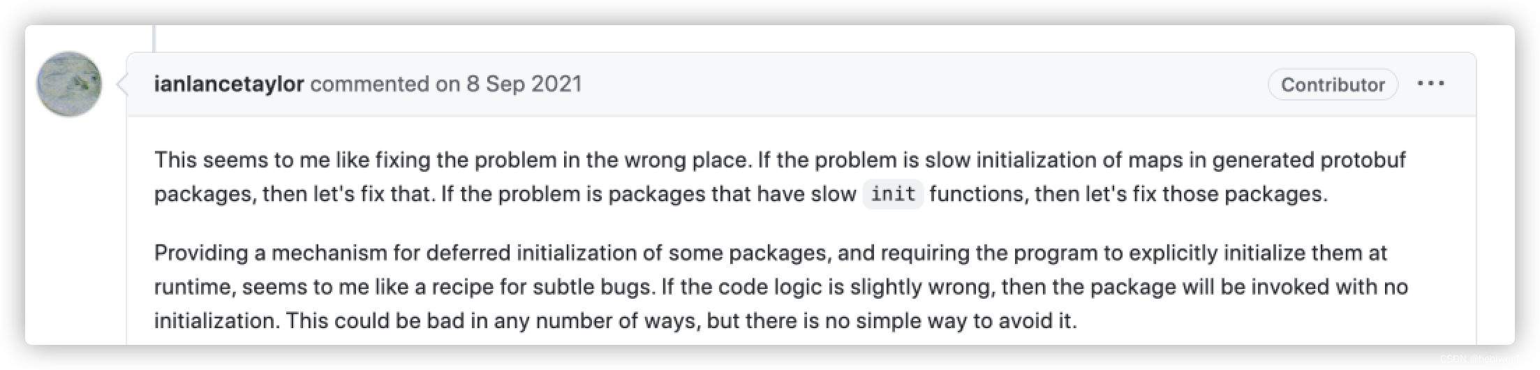 Go 团队在这一块的设计是比较理想化的,曹大也将其归类在 Go modules 的七宗罪之一了。而软件包的 init 函数乱初始化一堆的问题,也是有些似曾相识了。