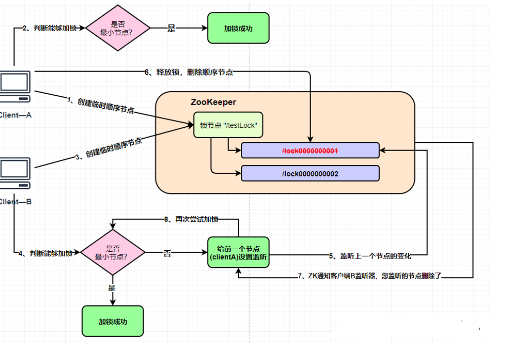 上面我们不是说了,当 clientB 加锁失败后,会给前一个节点(clientA)加上一个监听,当clientA被删除以后,就表示有人释放了锁,这个时候就会通知 clientB重新去获取锁。