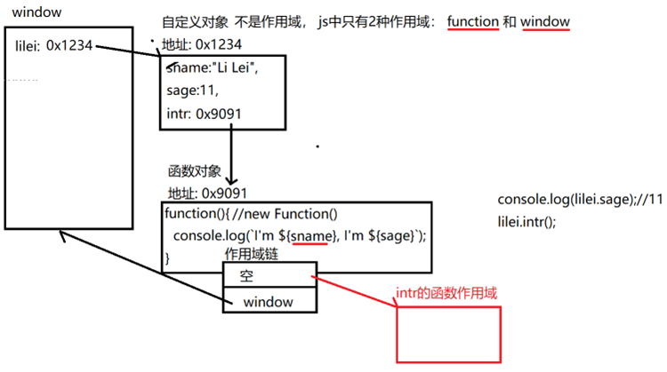 e. 原因: 虽然方法包含在对象内部,但是因为对象的{}不是一级作用域,所以在方法的作用域链中是不包含对象的内容的。是包含两个格子: 自己和window。所以,任何函数中不加.的变量,都只能在自己或全局window中查找。无权擅自进入对象中查找!所以,所有对象的方法,都无权直接访问对象属性值。