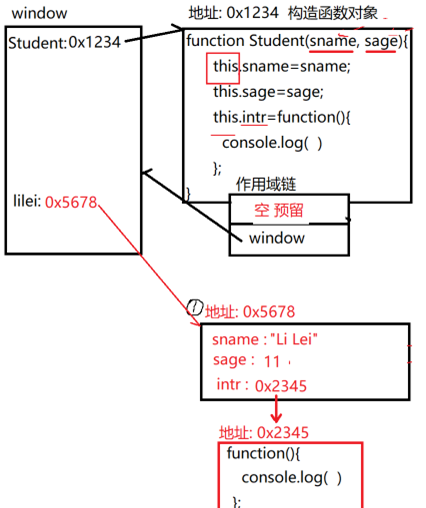 iii. 调用构造函数,传入实参,并自动替换构造函数中的this为new正在创建的新对象。构造函数中,通过强行赋值的方式为新对象添加规定的属性,并保存属性值。