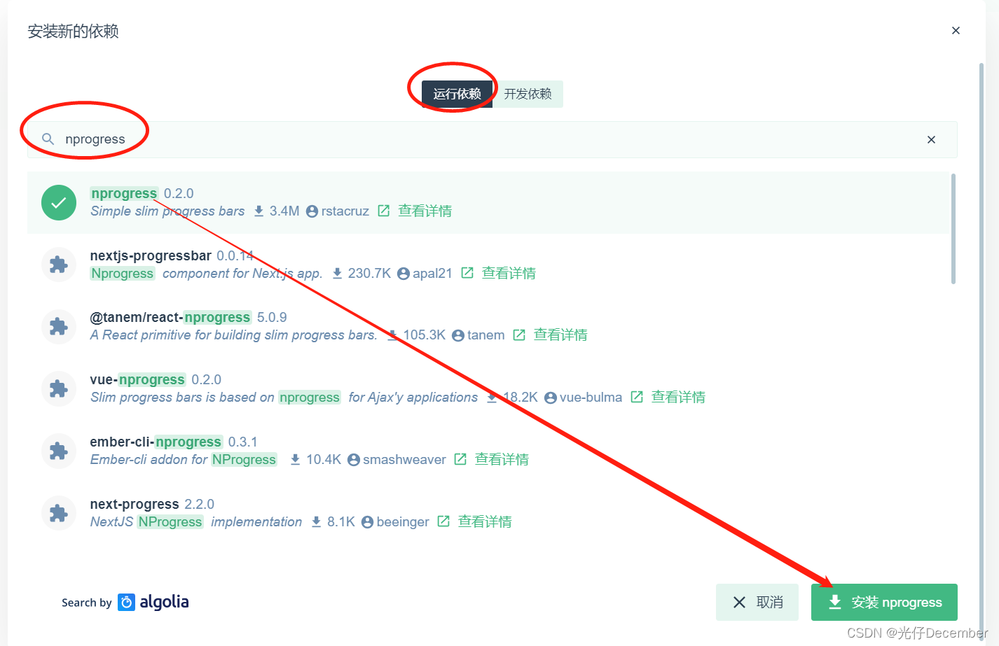 然后在“运行依赖”下搜索“nprogress”,下载最新版本: