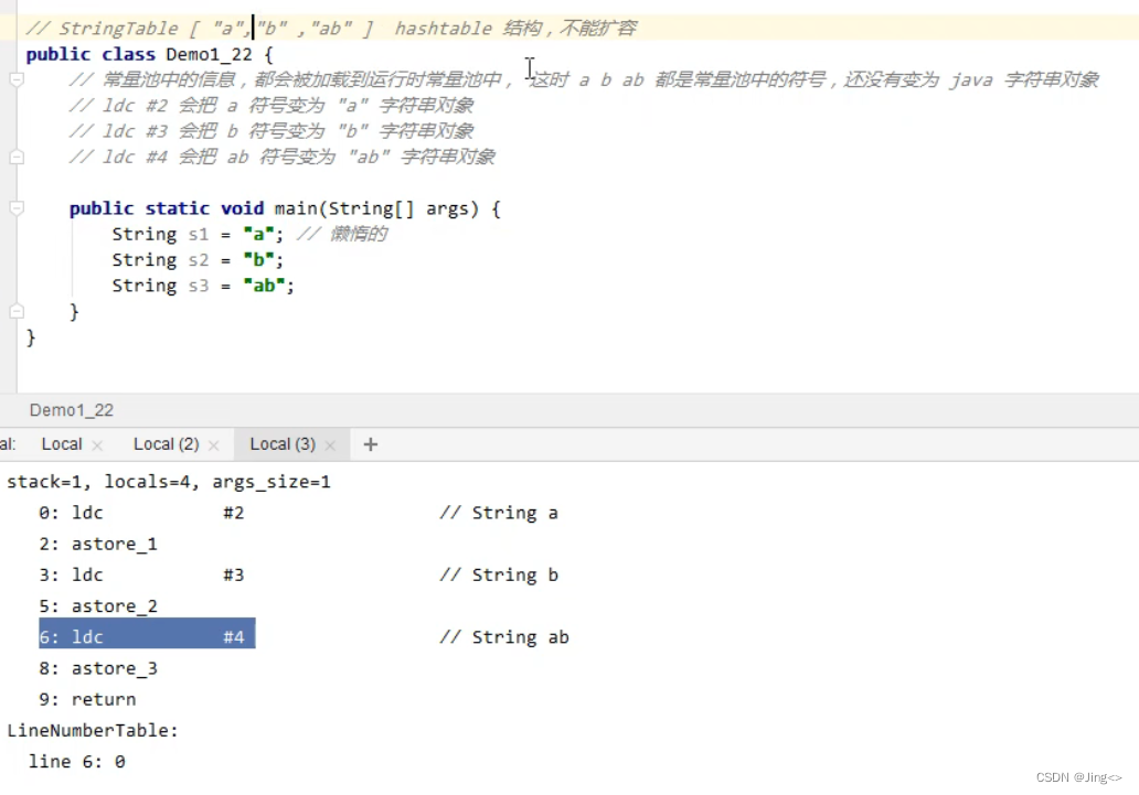 第6行和第29行都是在常量池中的4号位置找一个值为ab的符号,所以当s3执行时,发现串池中还没这个对象,根据ab符号,创建ab对象,就会放入串池,等执行到s5时,在4号位置找ab符号,所以不会创建新的对象,会直接用串池中的对象。