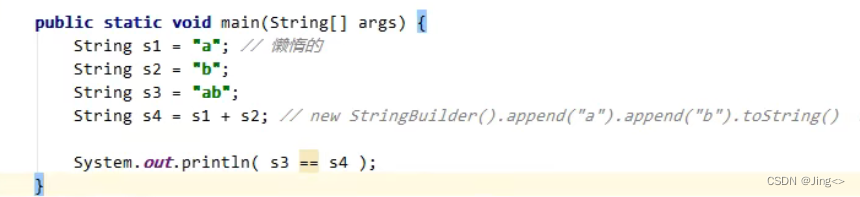 s3在串池中,而s4是拼接的ab,在toString的作用下, 将拼接的数据变成了一个新的字符串,是存在于堆中的,相当于 new String (“ab”)