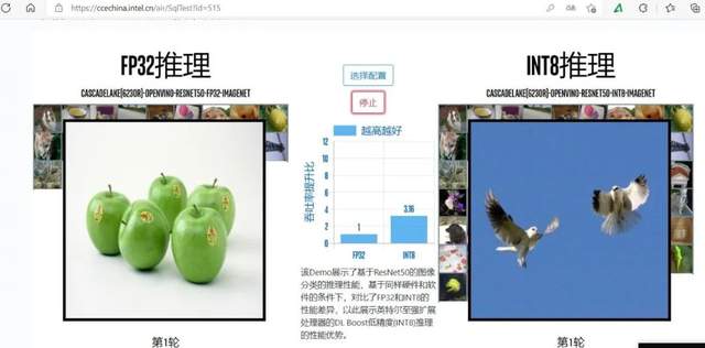 上面的 Demo 是基于 Resnet50 的图像分类的推理性能,利用 2 台相同的英特尔®至强®可扩展处理器,利用 OpenVINO™ 来分別部署 FP32 和 INT8 模型,同时运行图像分类推理服务,直观看出 INT8 推理的性能优势。
