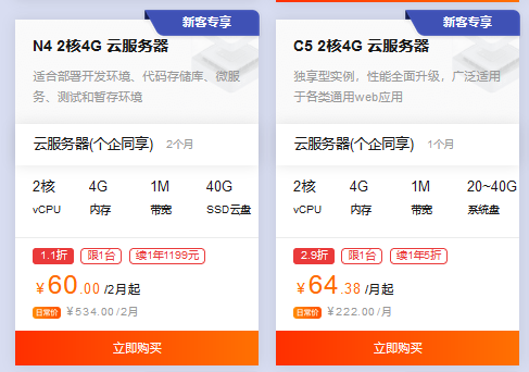 共享型N4 | 2核4G | 1M | 1.1折 | 60.00元/2月起 | 新用户专享 |