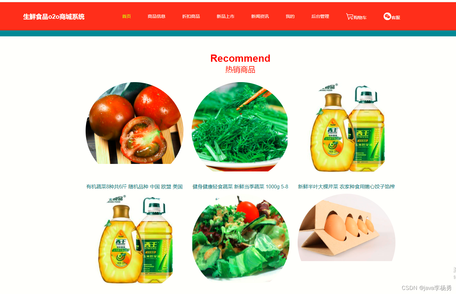 生鲜蔬菜食品商城系统,在系统首页可以查看首页、商品信息、特价区、商品折扣、公告资讯、个人中心、后台管理、购物车、客服,如图所示。