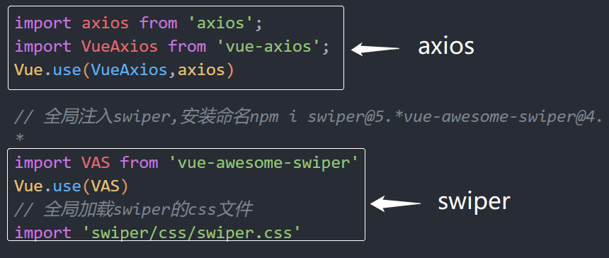安装命令: npm i swiper@5.* vue-awesome-swiper@4.*