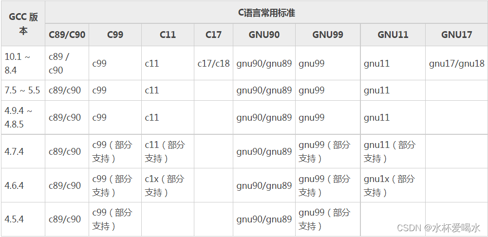 读者可能会问,这么多标准,GCC 编译器使用的到底是哪一套呢?不同版本的 GCC 编译器,默认使用的标准版本也不尽相同。 那么,我们可以手动控制 GCC 编译器使用哪个编译标准吗?答案是肯定的,对于编译 C、C++ 程序来说,借助 -std 选项即可手动控制 GCC 编译程序时所使用的编译标准。也就是说,当使用 gcc 指令编译 C 语言程序时,我们可以借助 -std 选项指定要使用的编译标准;