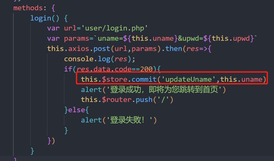登录成功后,把用户名存储给共享的vuex里,要触发vuex的mutations中的方法,用$store中的commit的方法