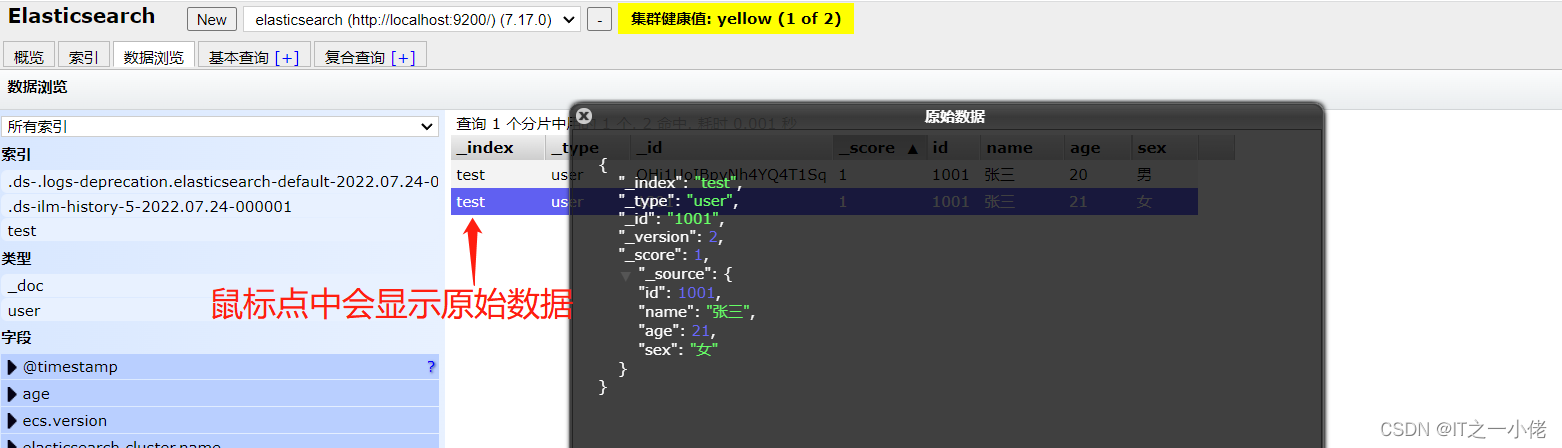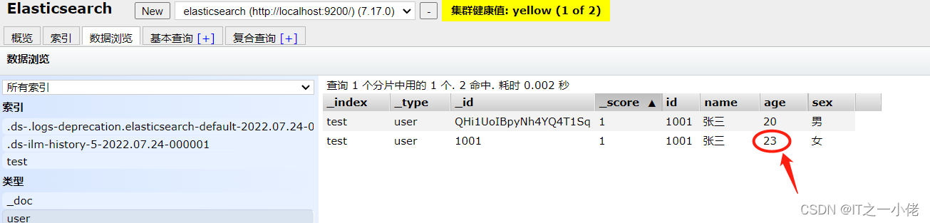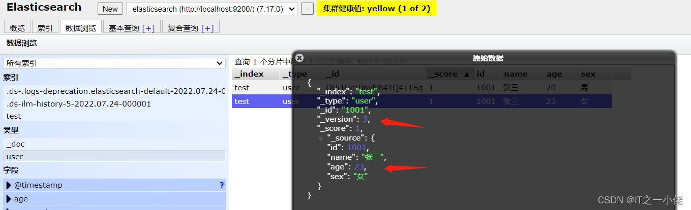 通过上面示例可以看到数据已经被覆盖了。 问题来了,可以局部更新吗? -- 可以的。 前面不是说,文档数据不能更新吗?