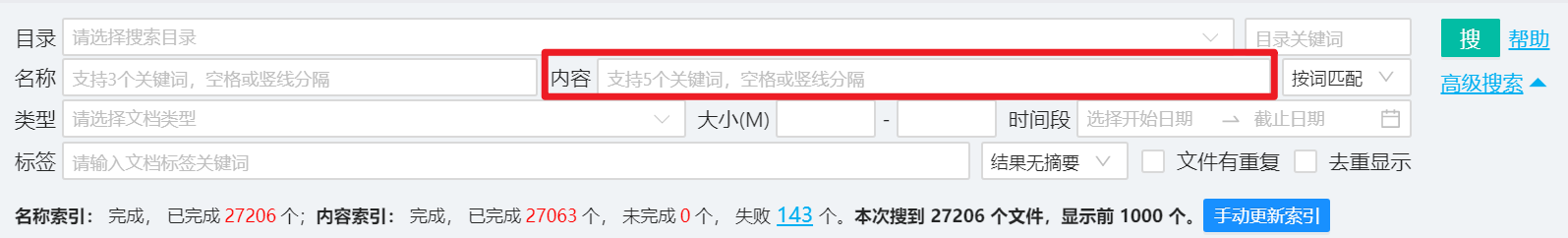 支持根据“文件内容、目录、类型、大小、时间、标签、是否重复”组合条件搜索文件。支持多关键词搜索,不支持关键词排除搜索。