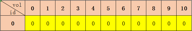 因此,根据上面两条的分析,通过降维构建一个一维数组 c[0~V] 便可实现0-1背包问题所需的存储需求,这就是所谓通过降维达到优化空间的方法。下图中黄色单元格的值便是 c[0~V] 的值,即将物品放入容量为 vol (vol=0~V)的背包中时,所获得的最大价值。