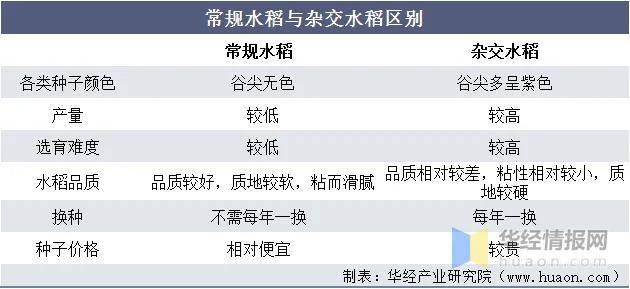 我国是全球第一个成功研发和推广杂交水稻的国家。而常规水稻是可以留种且后代不分离的水稻品种。常规稻和杂交水稻二者的根本区别在于是否可以自交留种。与常规水稻相比,杂交水稻的选育难度较高、品质相对较差,种子价格整体高于常规水稻。但由于杂交水稻结合了父本与母本的优势,使其具有穗大粒多、抗逆能力强、产量高等特点。
