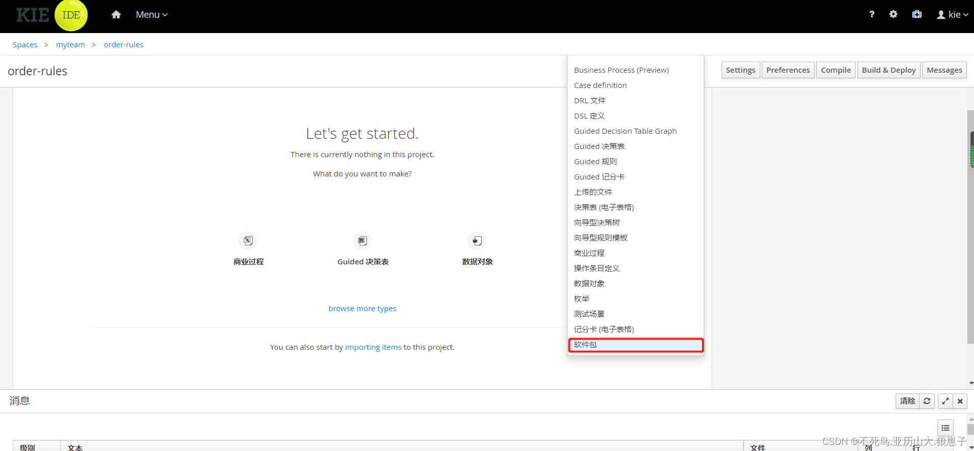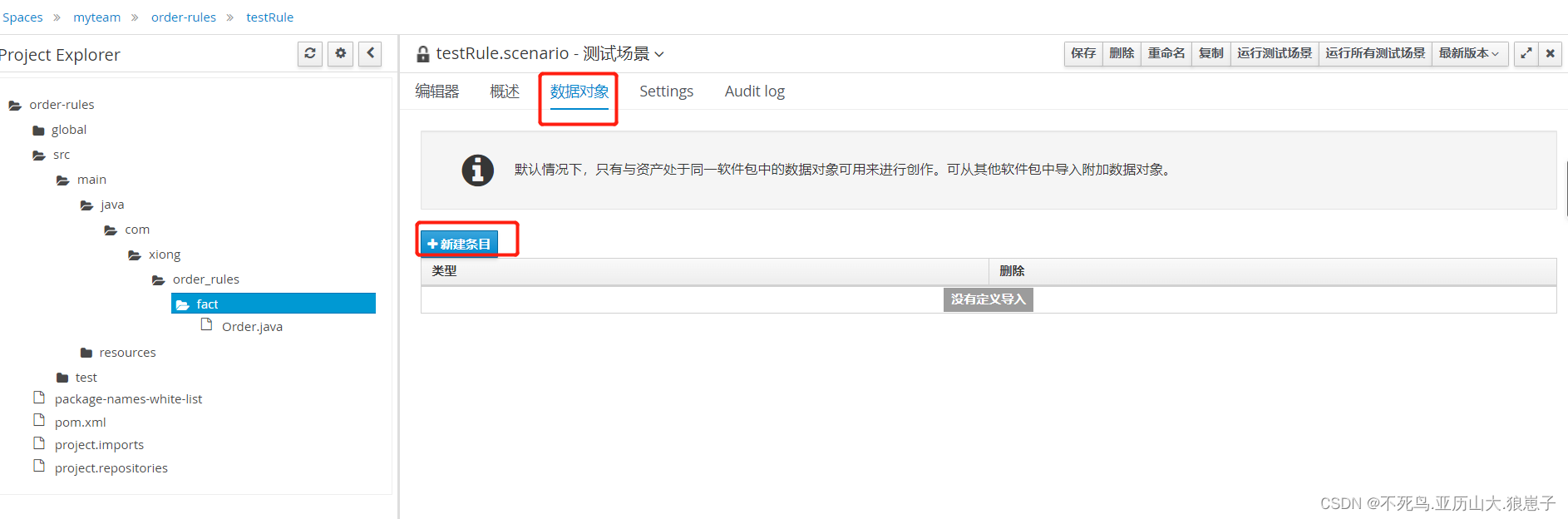 点击创建好的项⽬,进⼊主界⾯,点击右上⻆的【Create New Asset】,选择【软件包】,创建数据对 象存放的包 com.chenj.order_rules.fact