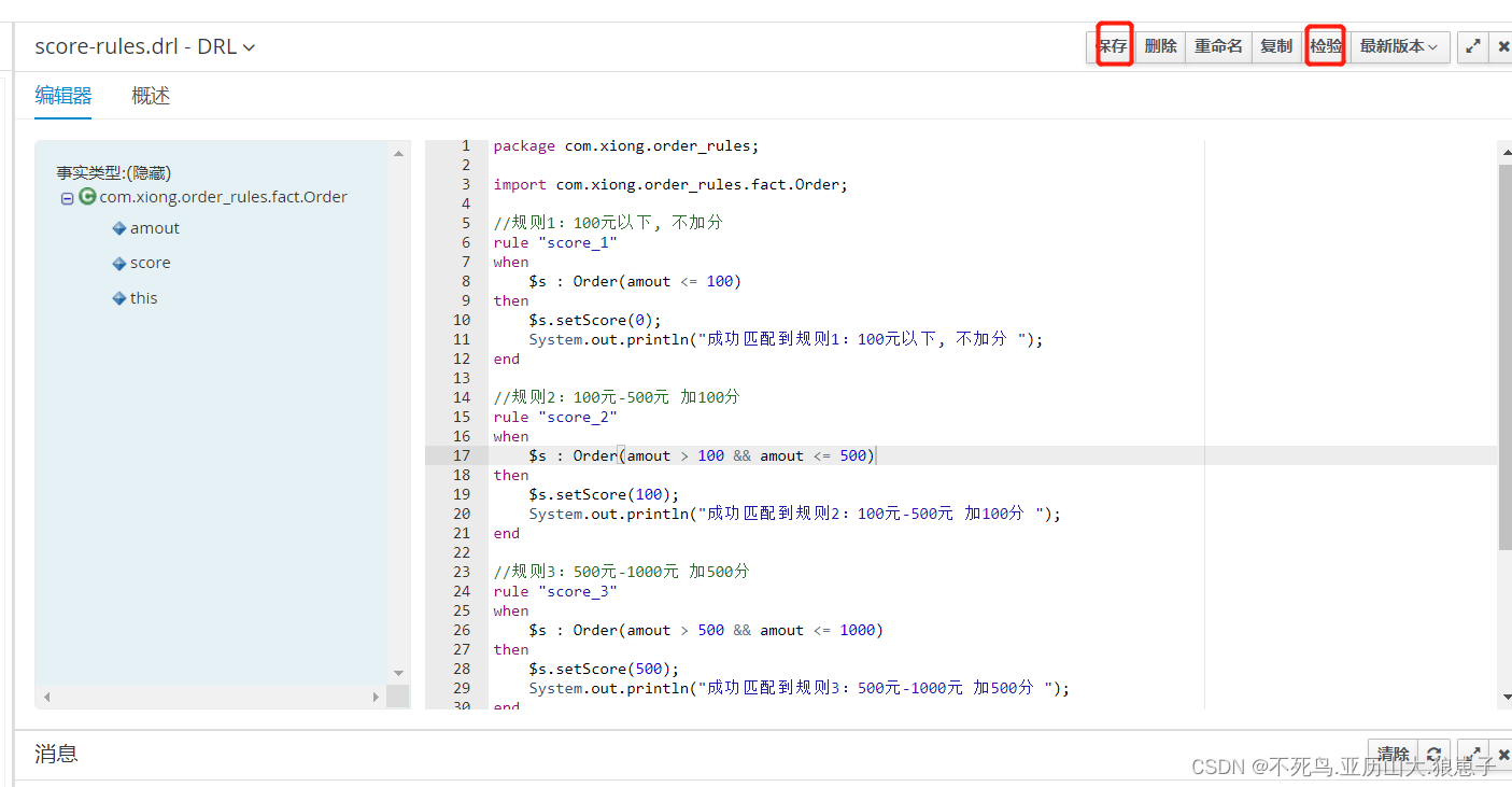 在编辑DRL⽂件⻚⾯右侧区域进⾏DRL⽂件的编写,点击右上⻆保存按钮完成保存操作,点击检 验按钮进⾏规则⽂件语法检查