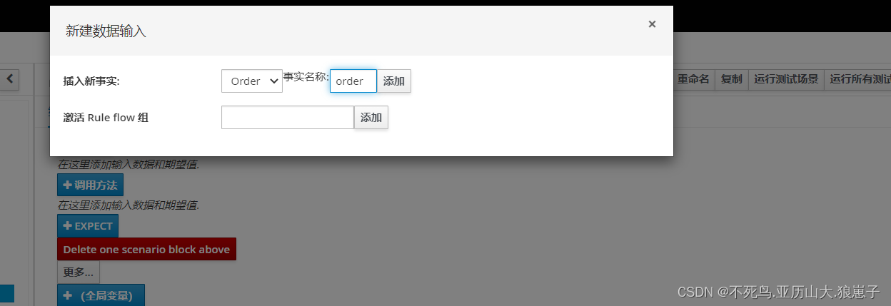 因为我们编写的规则⽂件中需要从⼯作内存中获取Order对象进⾏规则匹配,所以在测试场景中需 要准备Order对象给⼯作内存,点击“GIVEN”按钮弹出新建数据录⼊窗⼝,选择Order类,输⼊框 中输⼊事实名称(名称任意),如下图