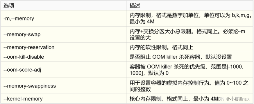 | 配额除以周期就是当前CPU资源的利用率 如果使用--oom-kill-disable选项的时候一定要加上-m选项 如果一个容器的软限制和硬限制大小一样,那它的资源会被系统优先分配(最高调度率) M代表物理内存 S代表总内存 S-M代表虚拟内存,即swap交换分区大小 unset代表不设置,为默认值(虚拟内存为2倍的M) -1代表当前物理机有多少虚拟内存(swap大小),当前容器的虚拟内存就有多少。 |