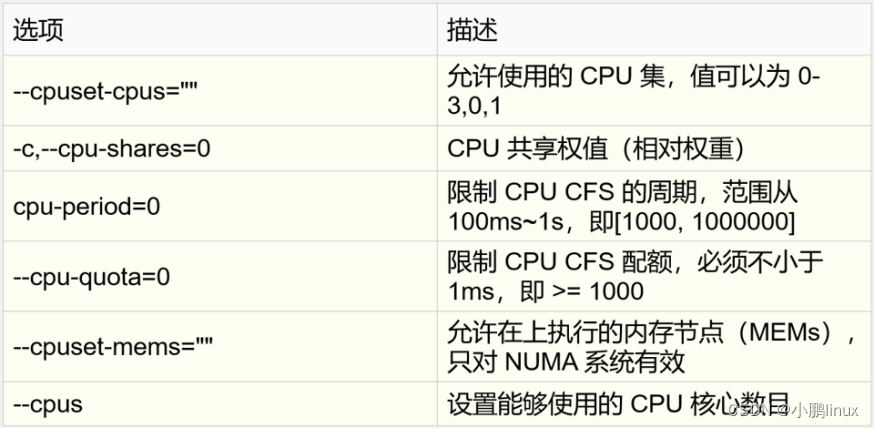 --cpuset-cpus 0亲核心绑定,CPU如果有4个,则序号为0,1,2,3。所以0代表第一个CPU。 即--cpuset-cpus 0将限制为绑定到第一个CPU上,让第一个CPU进行工作,则CPU利用率最大为100% |