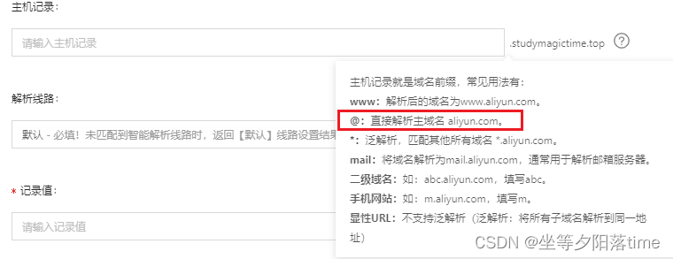 主机记录: 选择用@,等同于域名就是ip,只不过叫法不一样,指向的地方是一样的