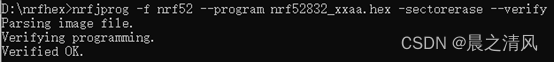 nrfjprog -f nrf52 --program nrf52832_xxaa.hex -sectorerase --verify