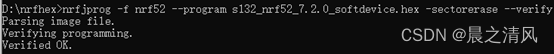 nrfjprog -f nrf52 --program s132_nrf52_7.2.0_softdevice.hex -sectorerase --verify
