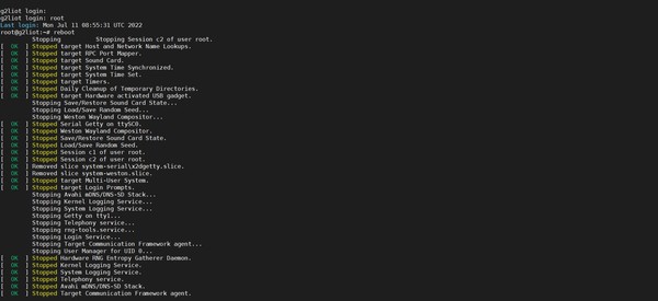 4.然后回车,输入账号root继续回车即可成功进入开发板,这时我们输入reboot重新启动开发板就可以查看到开发板启动信息了,如图16所示。
