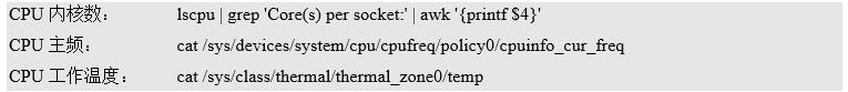 若需查看CPU信息,如读取内核数、主频、CPU工作温度可使用如下指令: