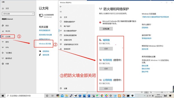 部分用户会遇到设置正确仍无法进行相互ping测试,可尝试关闭电脑端的防火墙,以Windows 10为例,关闭操作如图23所示,关闭后可再次尝试ping操作。