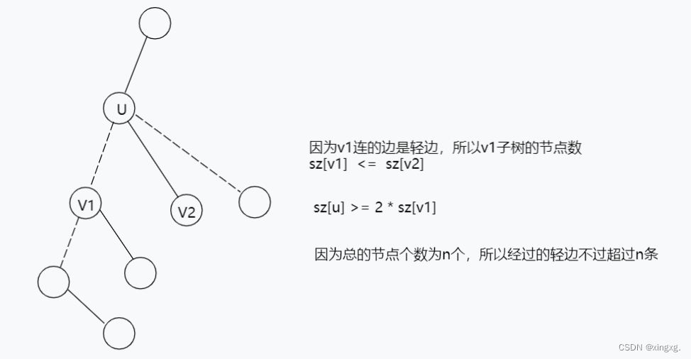 每个点都会连接一条重链的,可能这条重链的长度只有1,可能这个点就是这条重链的顶端。 一段重链 —— 一条轻链 —— 一段重链 —— 一条轻链 —— 一段重链 ...