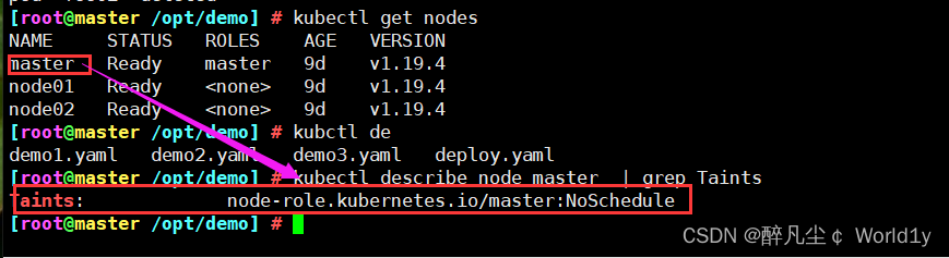 接下来看一个具体的例子,使用kubeadm部署和初始化的Kubernetes集群,master节点被设置了一个node-role.kubernetes.io/master:NoSchedule的污点,可以使用kubectl describe node 命令查看。这个污点表示默认情况下master节点将不会调度运行Pod,即不运行工作负载。