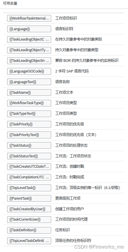 {{TaskLeadingObjectInstance}} 邮件内容中预定义变量--工作流实例ID,即流程关联业务单据主键,在邮件模版中使用可替换变量如&&LIFNR&&,此处取得对应数据后替换。