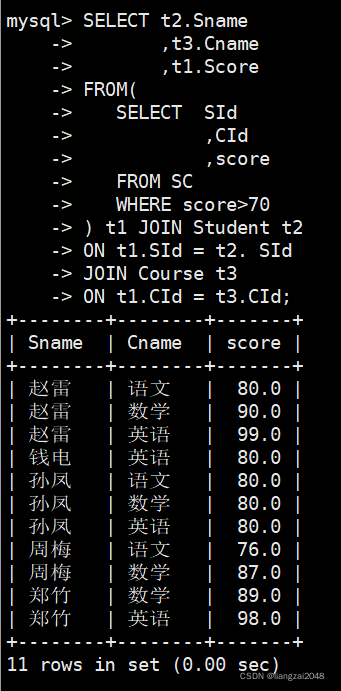 最后将上表作为t1表与Student表t2连接,取出成绩最高的学生信息