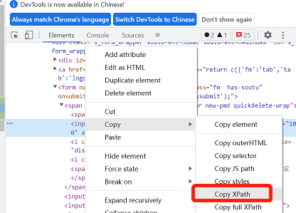 以百度搜索框元素为例,鼠标单机右键-Copy-Copy XPath即可获取其XPath相对路径