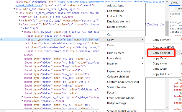 css selector可以直接在浏览器中复制,鼠标单机右键-Copy-Copy selector即可获取。