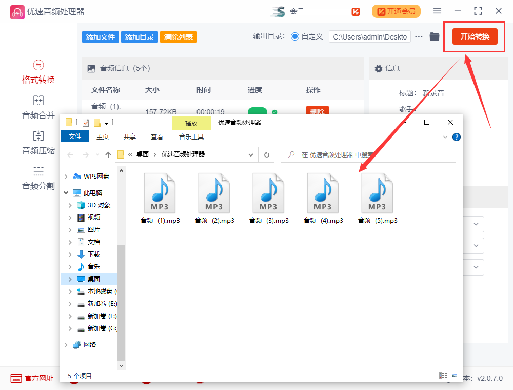 第四步,点击软件右上角的红色按键,启动音频格式转换,完成转换后软件会打开输出文件夹,可以看到转成的mp3全部保存在这里。