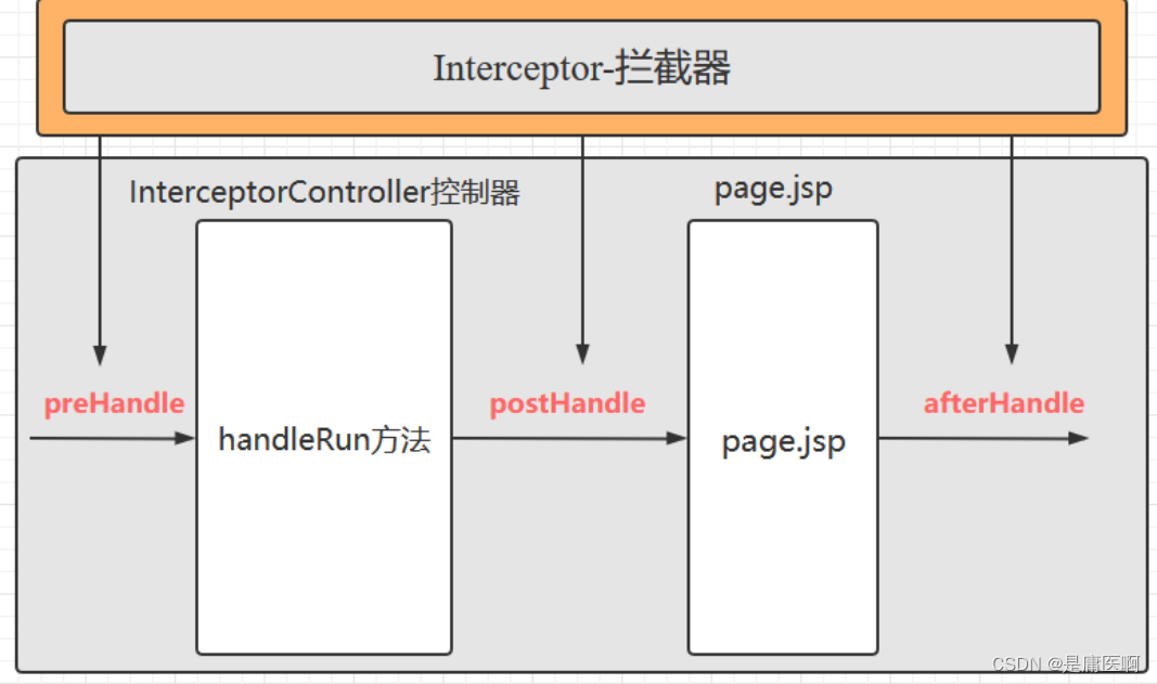 Spring的HandlerMapping支持拦截器,拦截器必须实现HandlerInterceptor接口,此接口里面有下面3中方法: