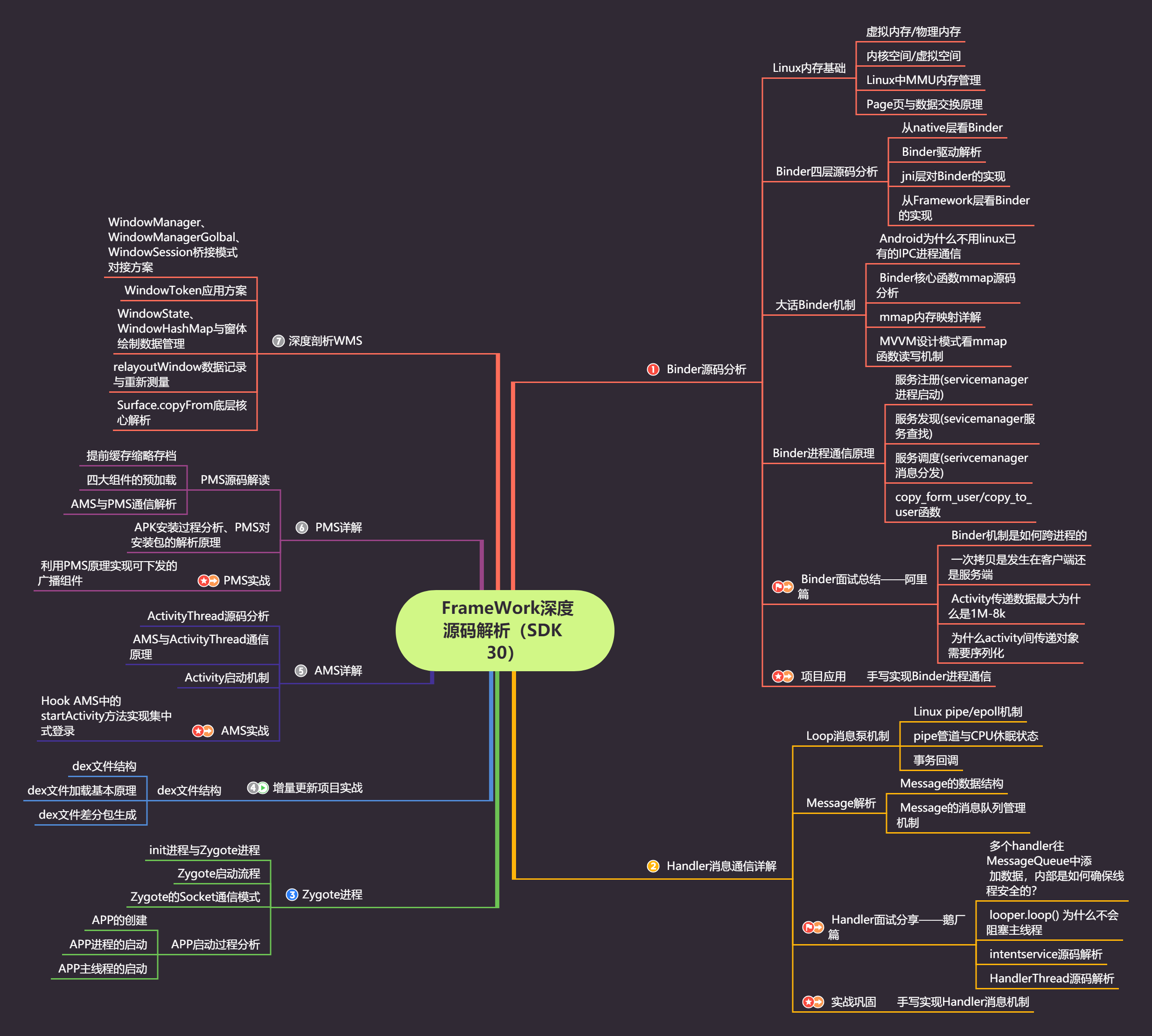 为了帮助大家深刻理解Framework源码,并将它应用到工作中,前段时间整理收集的关于Android Framework的知识脑图总结和源码学习手册文档!既能够夯实底层原理、源码解析等核心技术点,又能够掌握普通开发者,难以触及的复杂系统问题设计方案。那你在工作中、团队里、面试时,也就拥有了同行难以复制的核心竞争力。