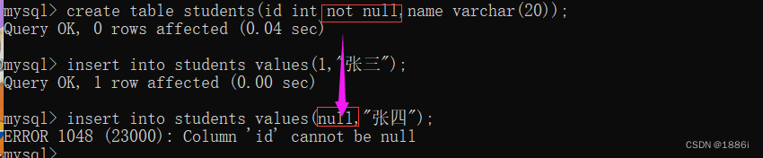 创建好表后,有not null约束的列不可以赋值为null