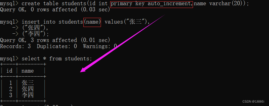 自增主键:对于整数类型的主键常常搭配auto_increment时使用,插入字段不给值时,会使用最大值+1