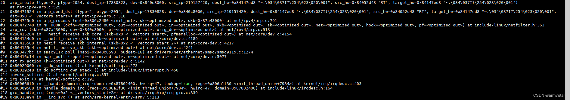 ARP报文最后通过调用网卡设备驱动函数smsc911x_hard_start_xmit发送到网卡里面,smsc911x_hard_start_xmit调用栈如下: