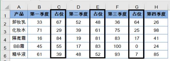 在每个季度后插入新列,字段命名为“占位”,分别使用100-季度值得到占位,也就是说每个季度的区间为100,此区间值可根据用户数据自定义。