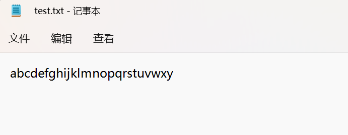 #include int main() { FILE* pf = fopen("test.txt", "w"); if (pf == NULL) { perror("fopen:"); return 1; } for (char i = 'a'; i < 'z'; ++i) { fputc(i, pf); } fclose(pf); pf = NULL; return 0; }运行完我们打开文件时,就发现字母全部输入进入文件中了