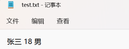 #include struct Person { char name[10]; int age; char sex[4]; }; int main() { FILE* pf = fopen("test.txt", "wb"); if (pf == NULL) { perror("fopen:"); return 1; } struct Person p = { "李四",18,"男" }; fwrite(&p, sizeof(struct Person), 1, pf); return 0; }写入的是以二进制的性质,但是中文的二进制还是中文。