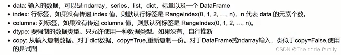 pd.DataFrame(data=None,index=None,columns=None,dtype=None,copy=None)