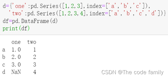 Series创建DataFrame对象(字典对应的值是Series):可以传递一个字典形式的Series,从而创建一个DataFrame对象,其输出结果的行索是所有index合集