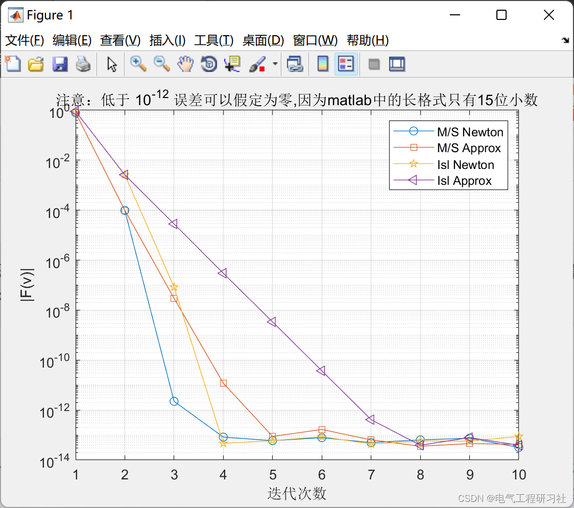 - title('注意:低于 10^{-12} 误差可以假定为零,因为matlab中的长格式只有15位小数')