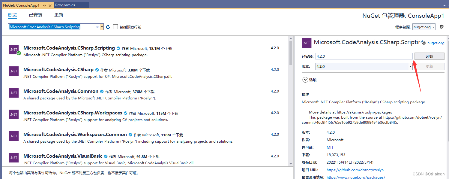 然后搜索Microsoft.CodeAnalysis.CSharp.Scripting