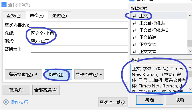 下图是设置查找框或替换框的格式-样式为正文样式的方法;我们选中正文样式后,在说明小框中发觉了各种规则。
