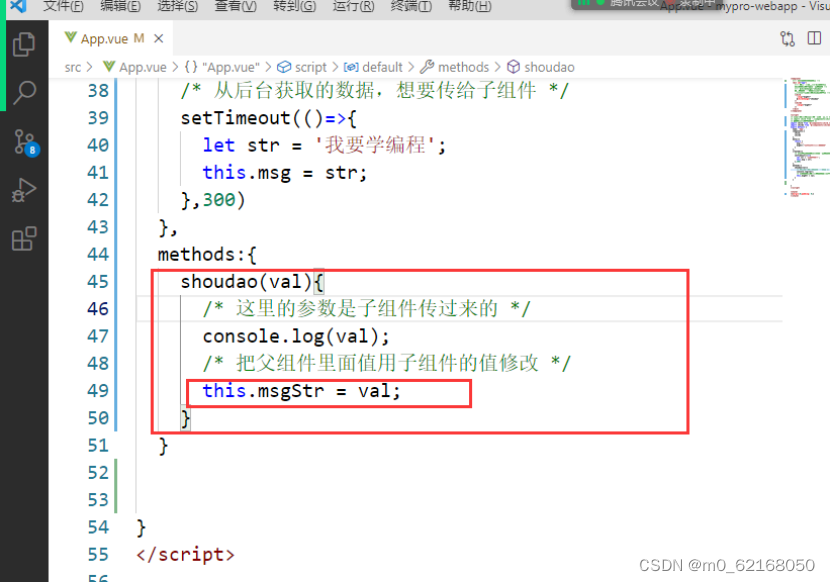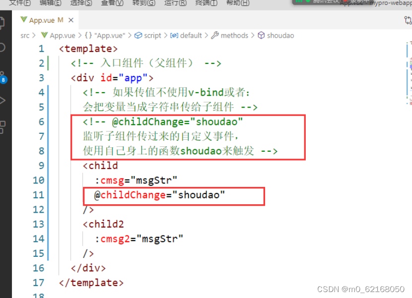 父组件监听自定义事件,是自己的方法shoudao来接收值,
