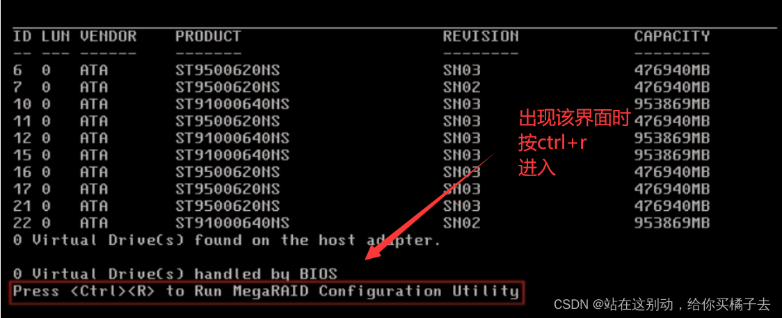 重启服务器,等会就能看到Crtl+R的界面,然后按下Crtl+R可以进入raid设置界面。